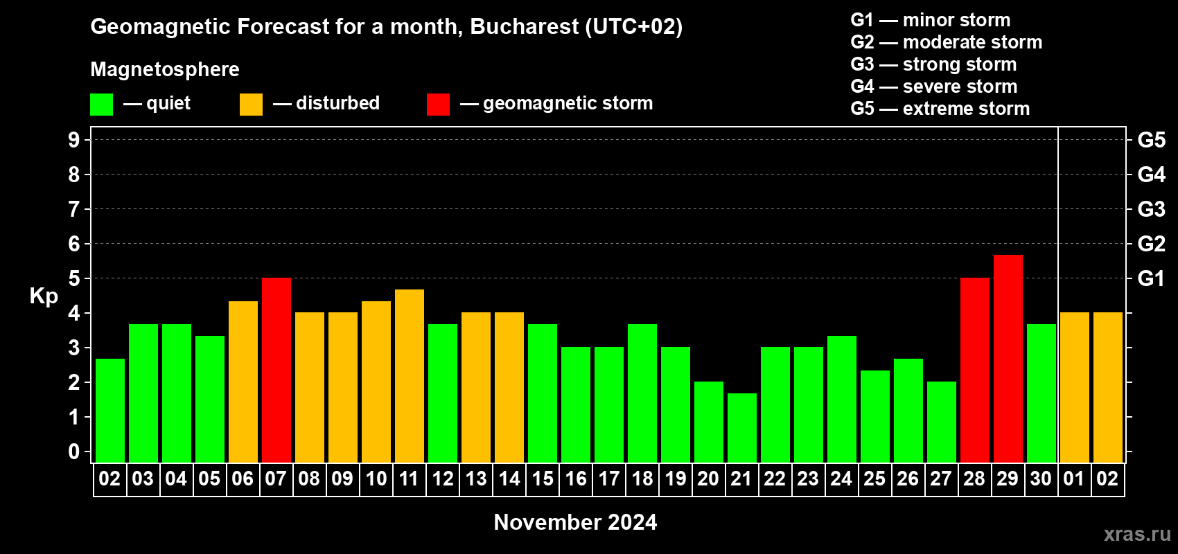 Geomagnetic storm forecast in Bucharest for Nov 02, 2024
