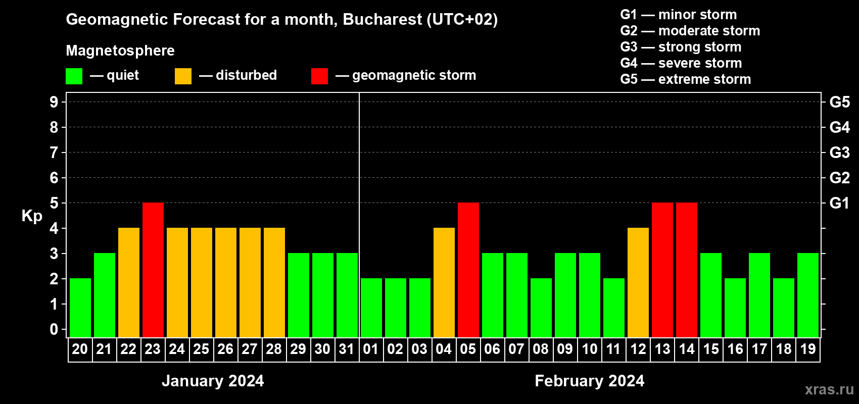 Geomagnetic storm forecast in Bucharest for Jan 20, 2024