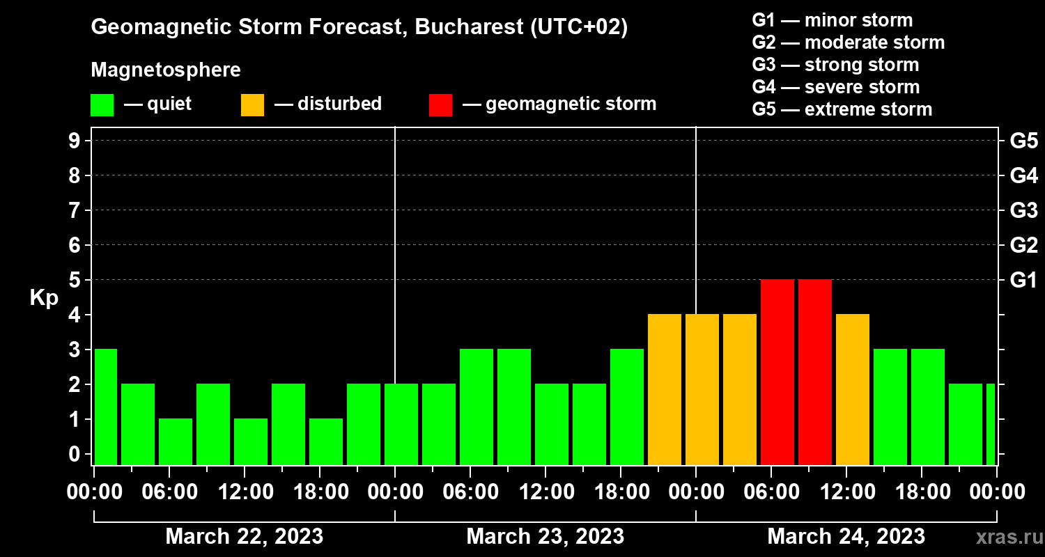 Geomagnetic storm forecast in Bucharest for Mar 22, 2023