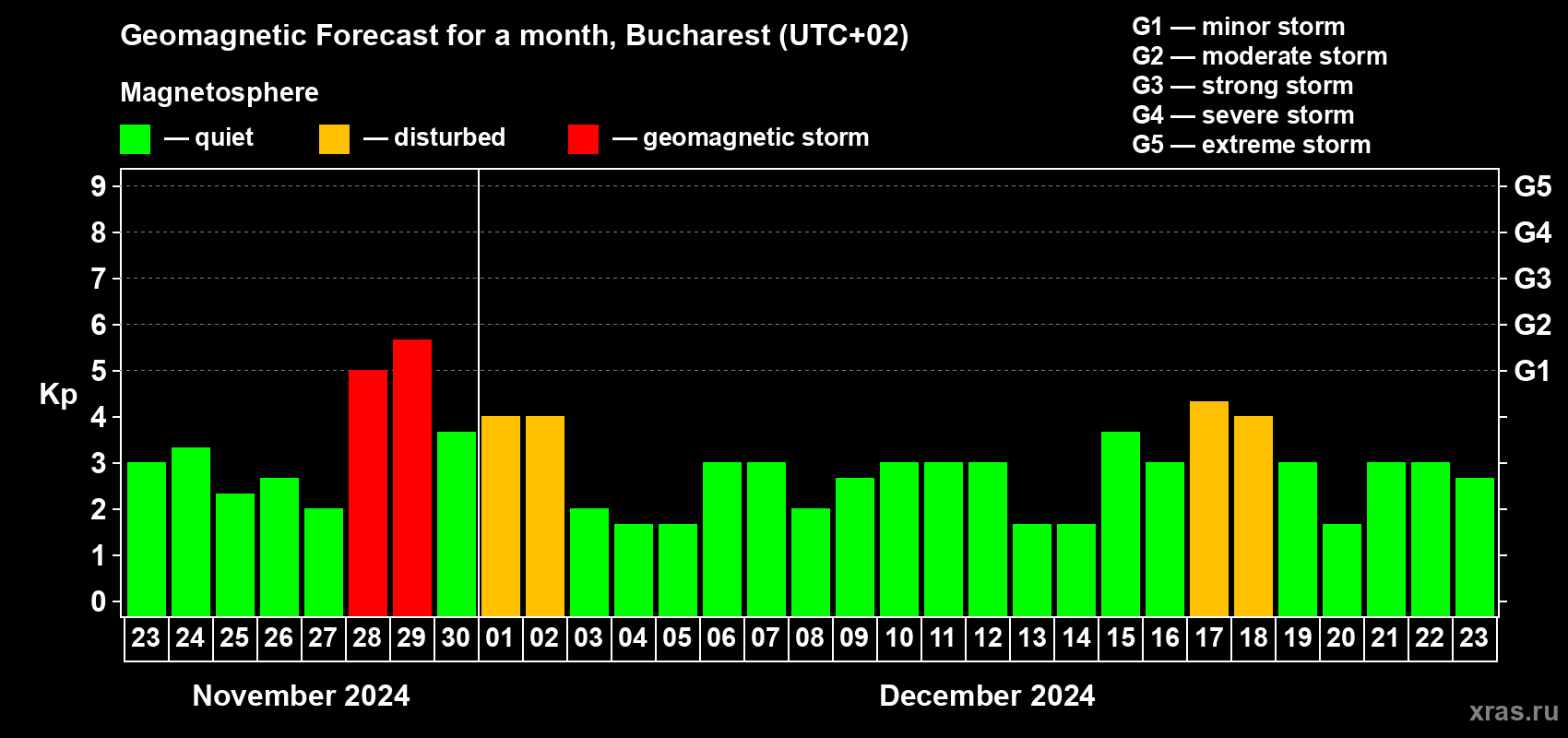 Geomagnetic storm forecast in Bucharest for Nov 23, 2024