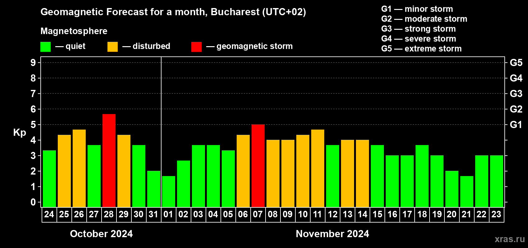 Geomagnetic storm forecast in Bucharest for Oct 24, 2024