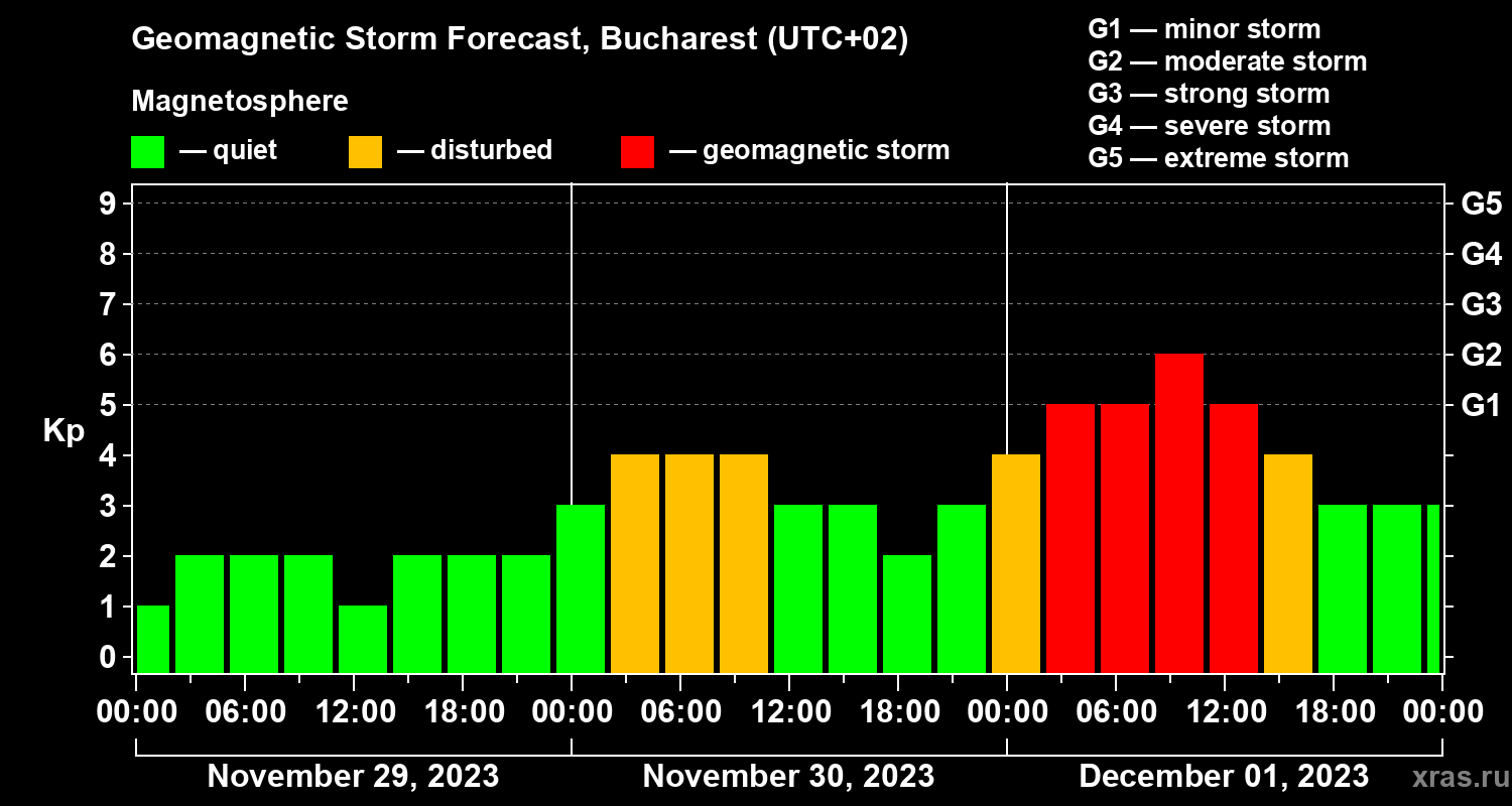 Geomagnetic storm forecast in Bucharest for Nov 29, 2023