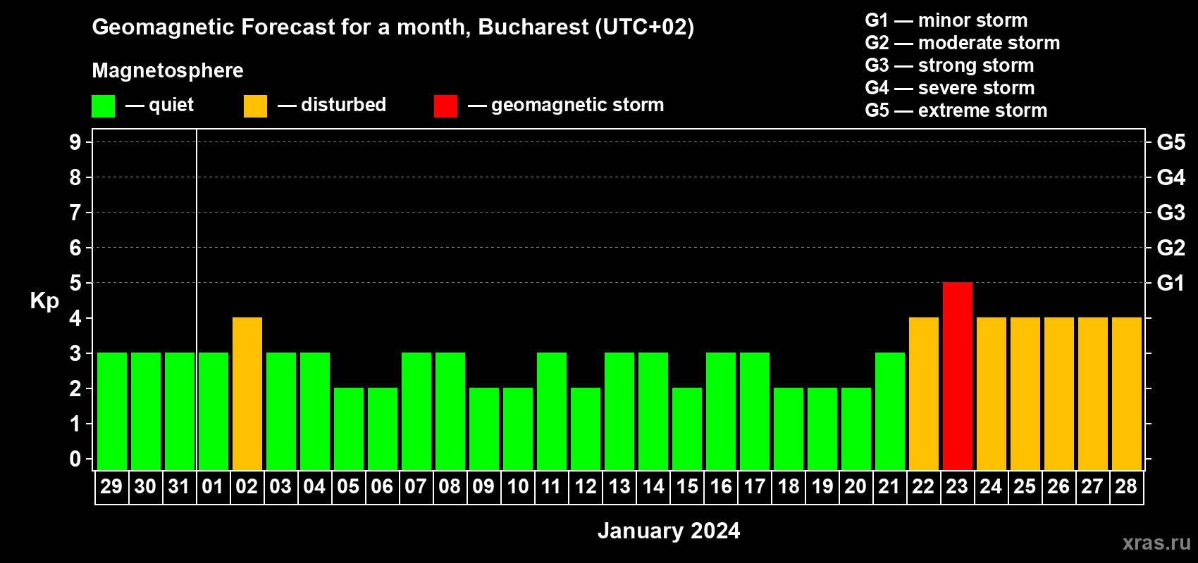 Geomagnetic storm forecast in Bucharest for Dec 29, 2023