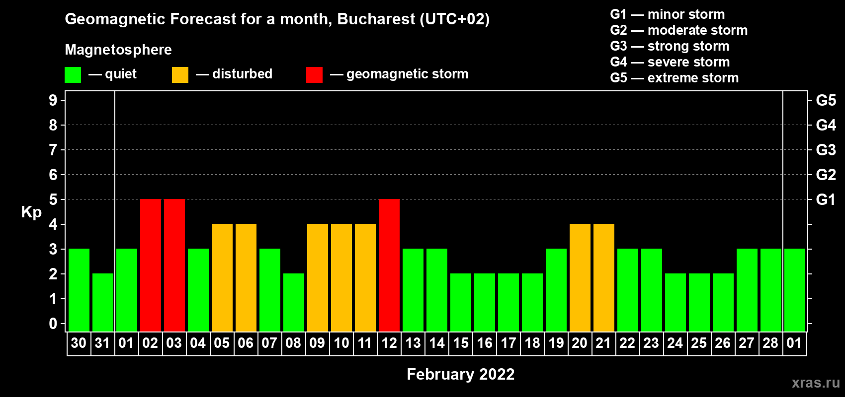 Geomagnetic storm forecast in Bucharest for Jan 30, 2022