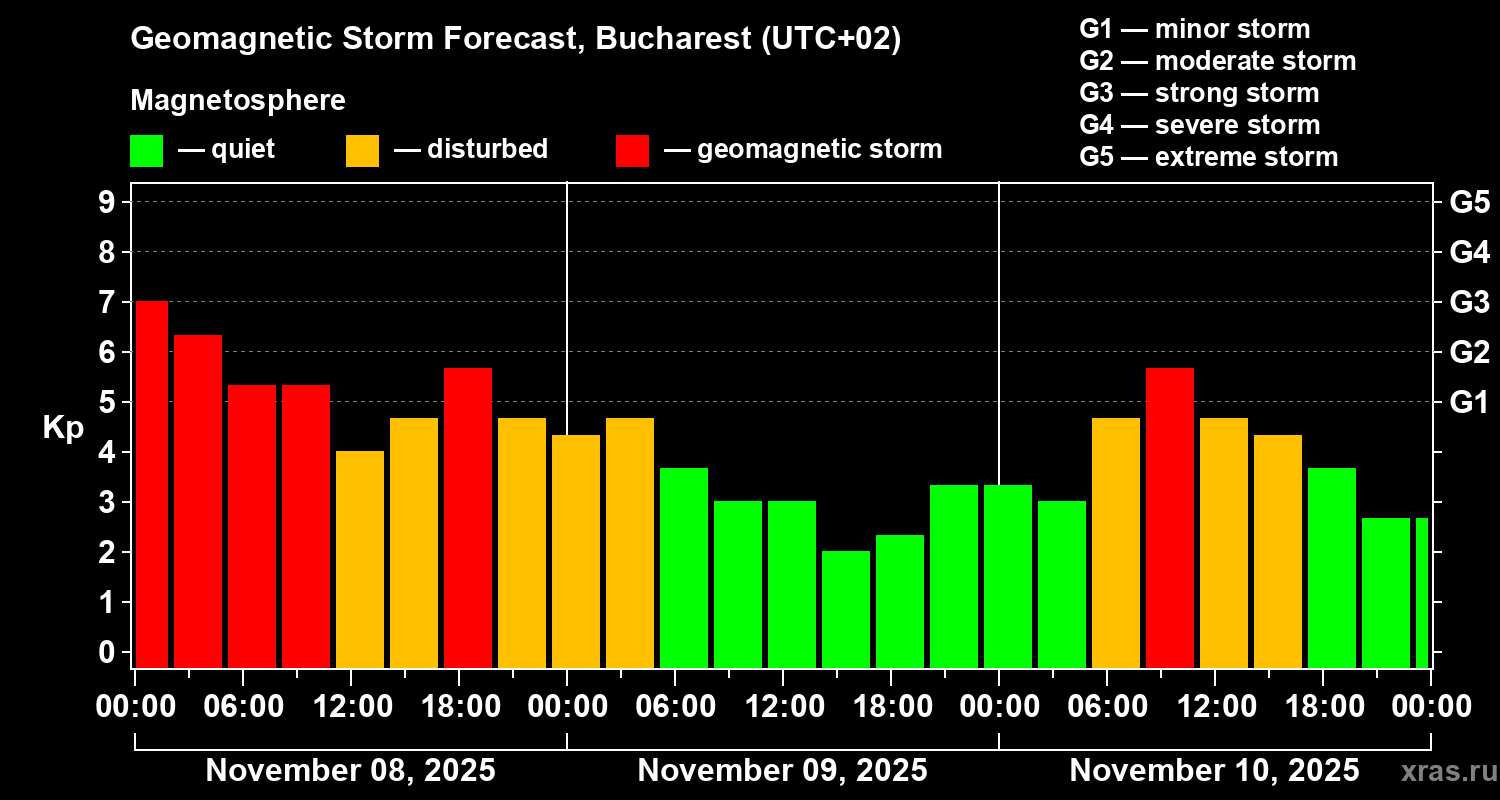 Geomagnetic storm forecast in Bucharest for Nov 08, 2025