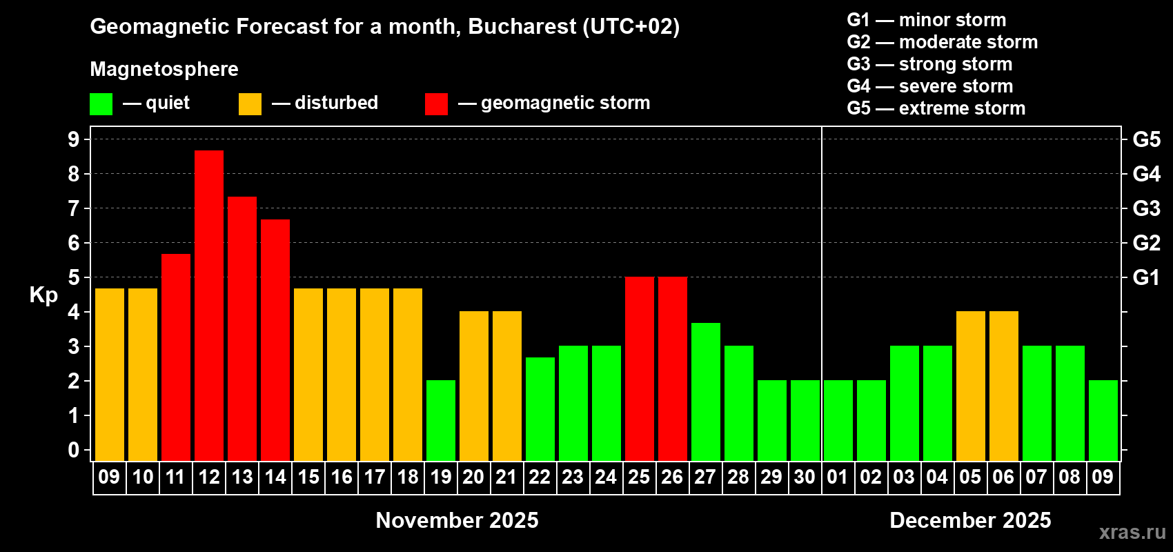 Geomagnetic storm forecast in Bucharest for Nov 09, 2025