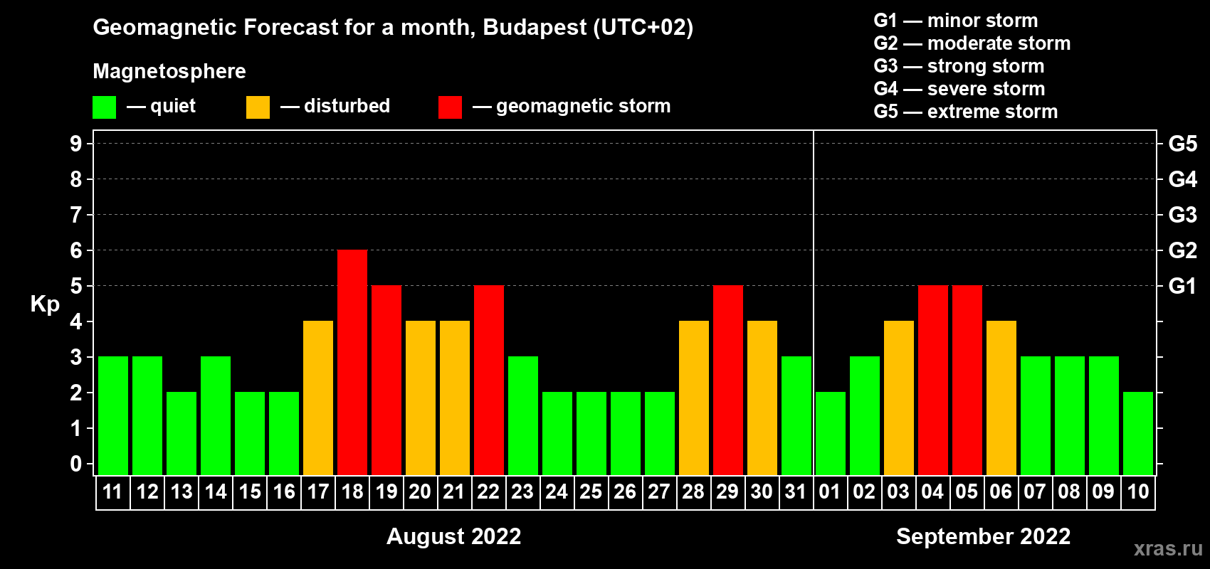 Geomagnetic storm forecast in Budapest for Aug 11, 2022