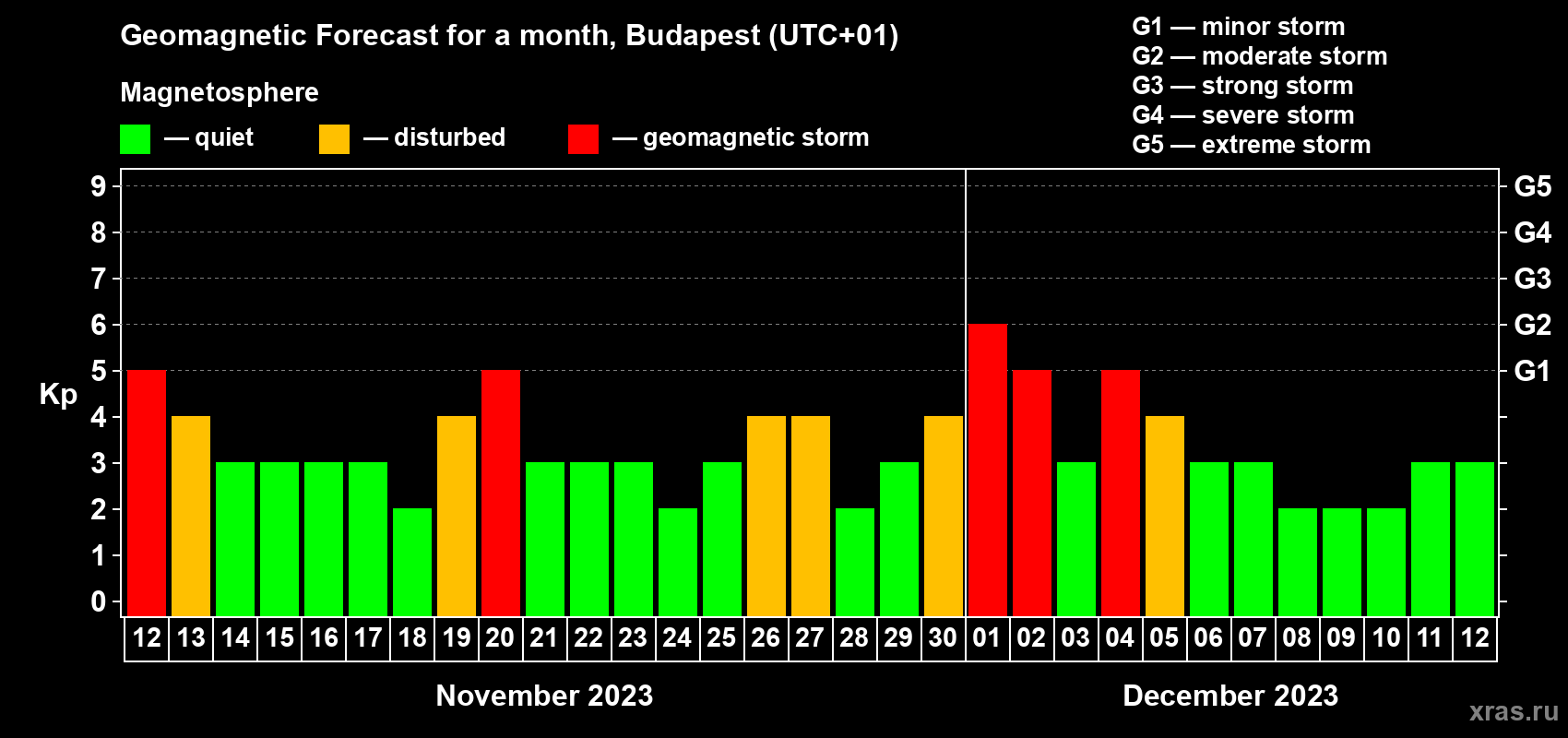 Geomagnetic storm forecast in Budapest for Nov 12, 2023