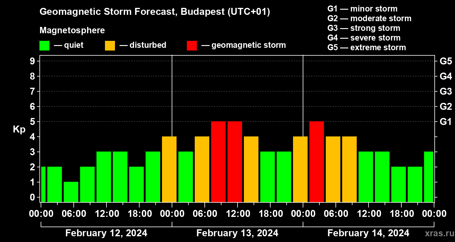 Geomagnetic activity forecast in Budapest — Feb 12, 2024