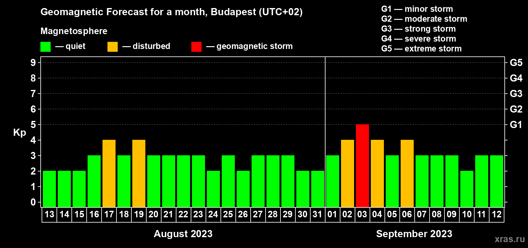 Geomagnetic activity forecast in Budapest — Aug 13, 2023