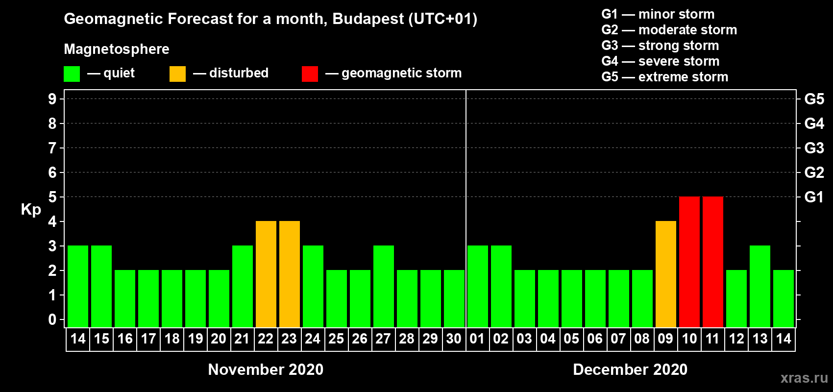 Geomagnetic storm forecast in Budapest for Nov 14, 2020