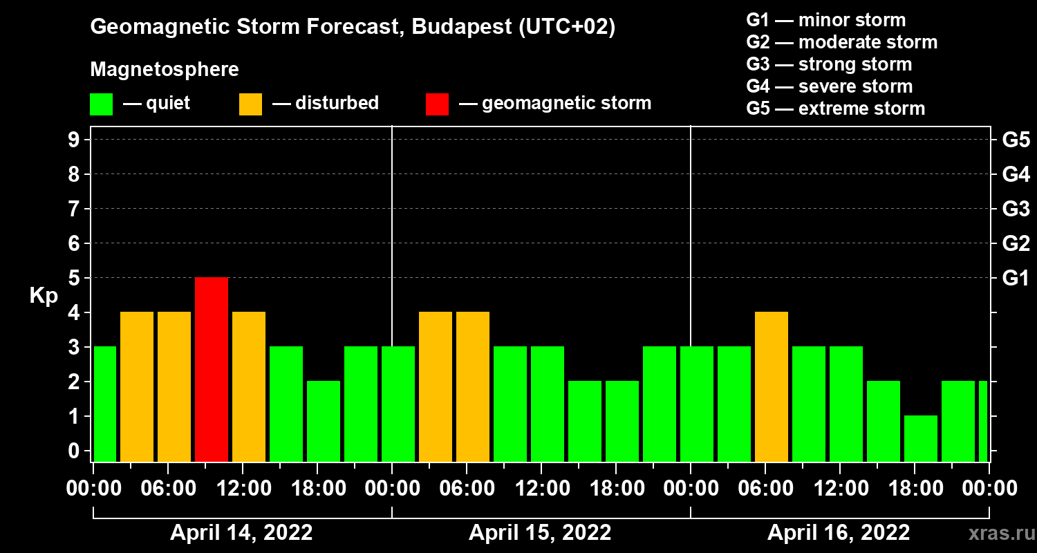 Geomagnetic storm forecast in Budapest for Apr 14, 2022