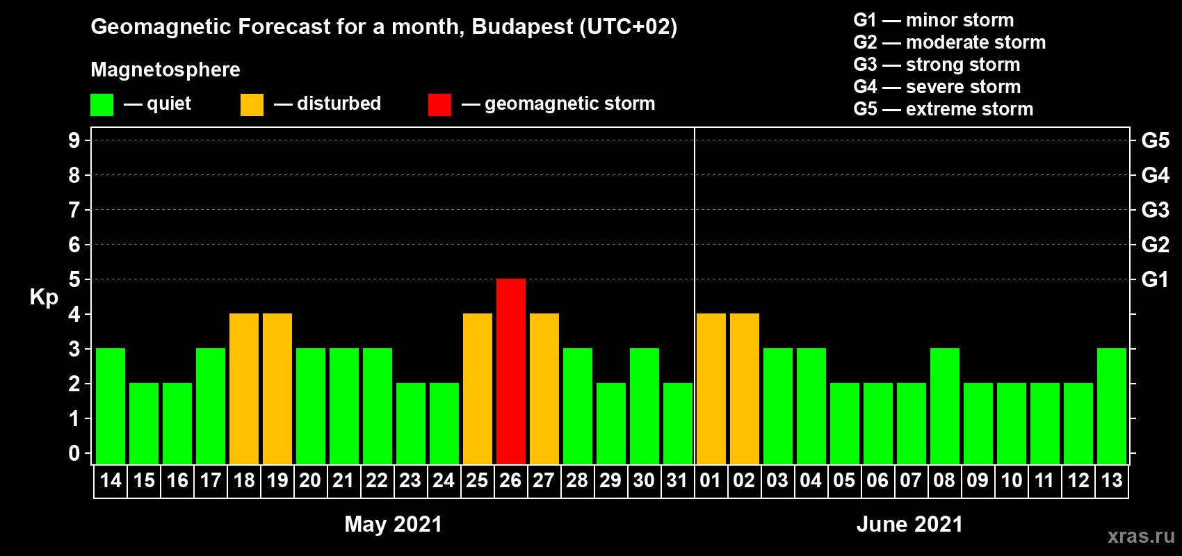 Geomagnetic storm forecast in Budapest for May 14, 2021
