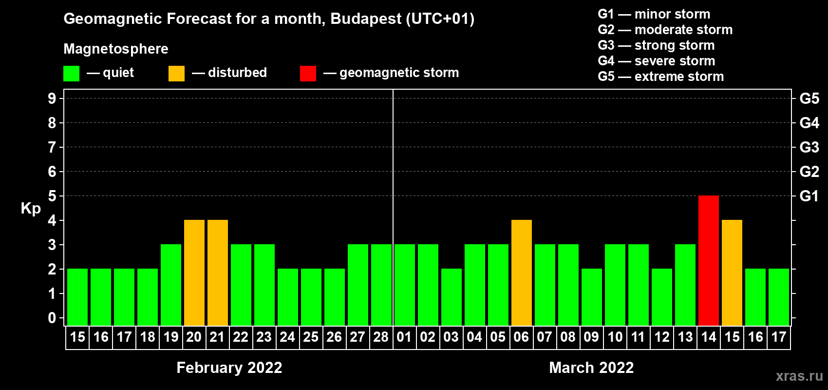 Geomagnetic storm forecast in Budapest for Feb 15, 2022