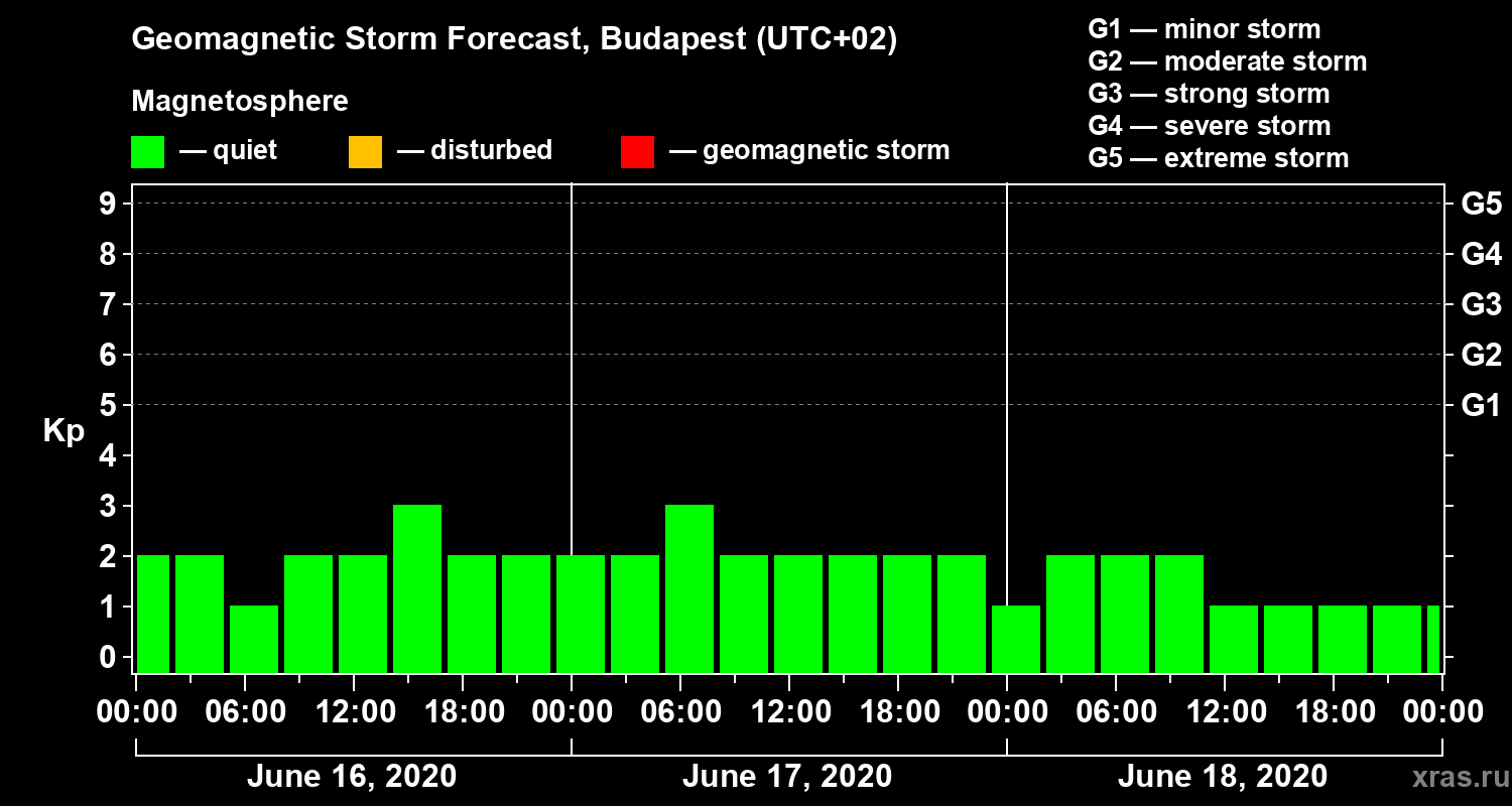 Geomagnetic storm forecast in Budapest for Jun 16, 2020