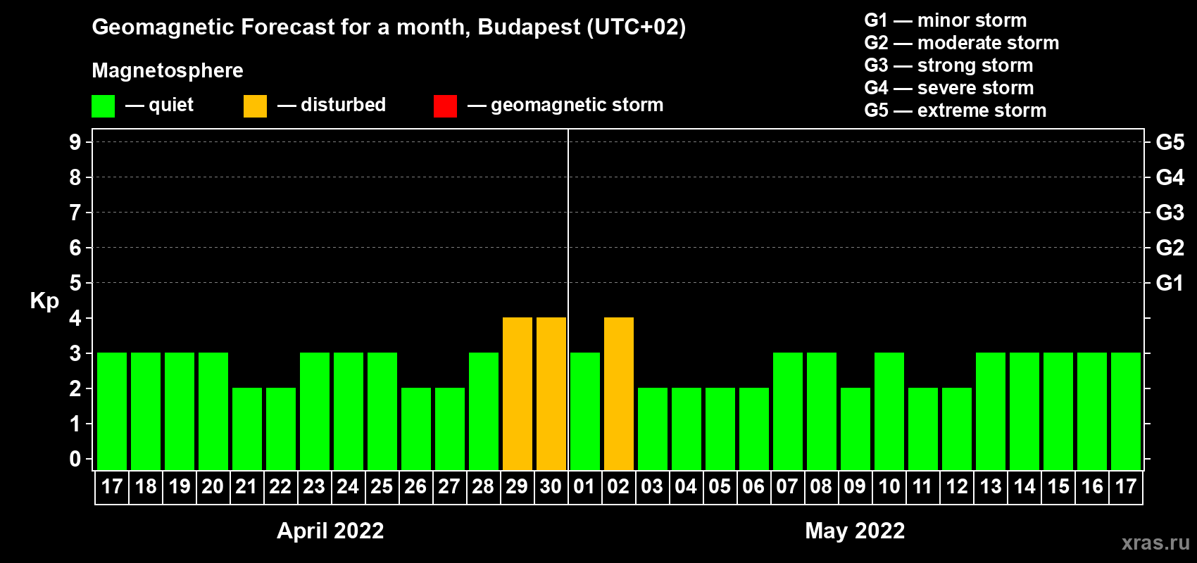 Geomagnetic storm forecast in Budapest for Apr 17, 2022