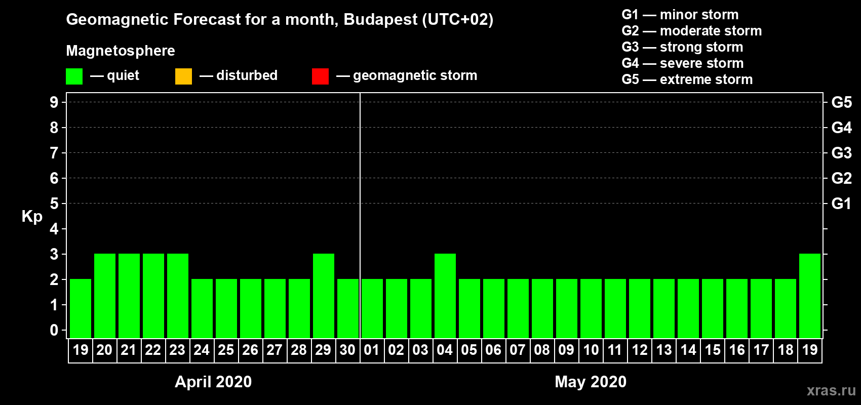 Geomagnetic storm forecast in Budapest for Apr 19, 2020