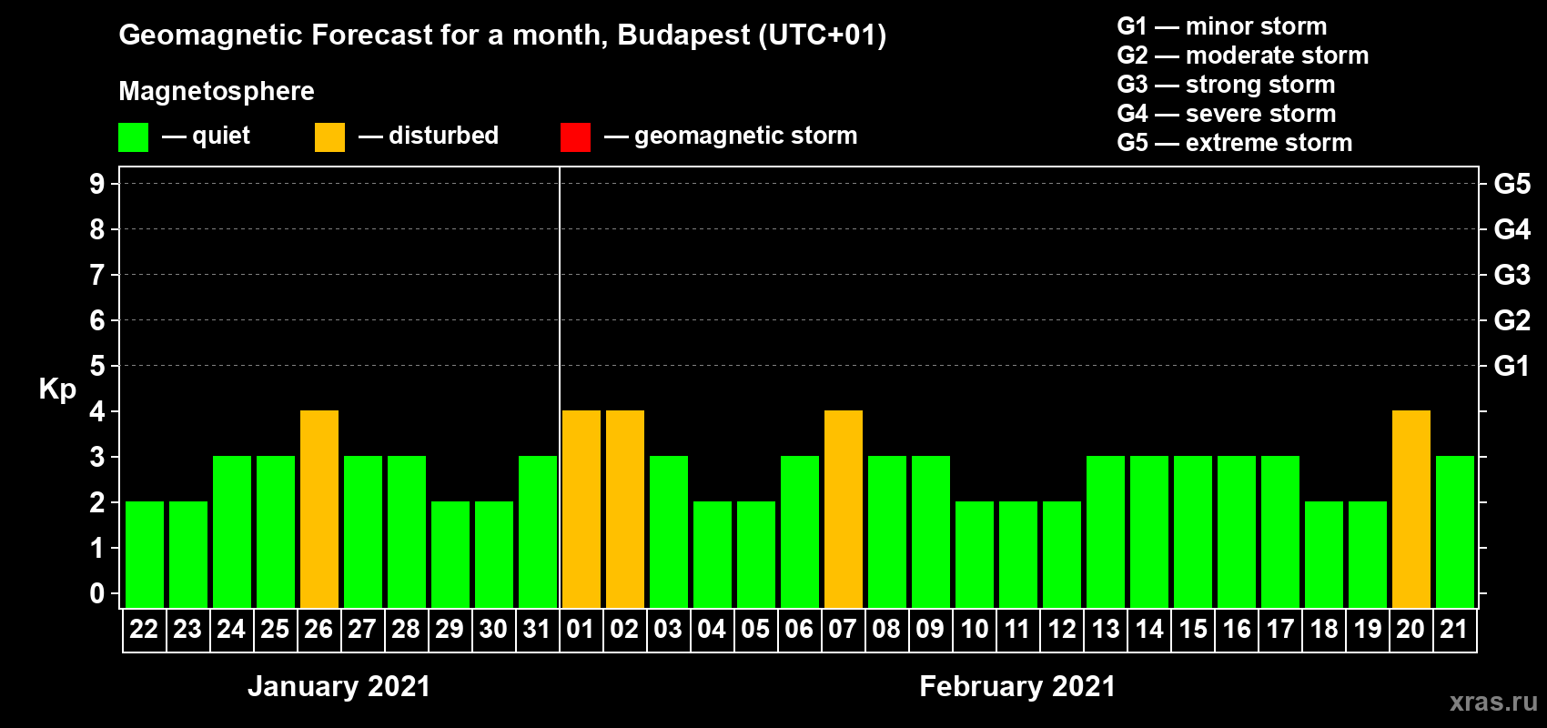 Geomagnetic storm forecast in Budapest for Jan 22, 2021