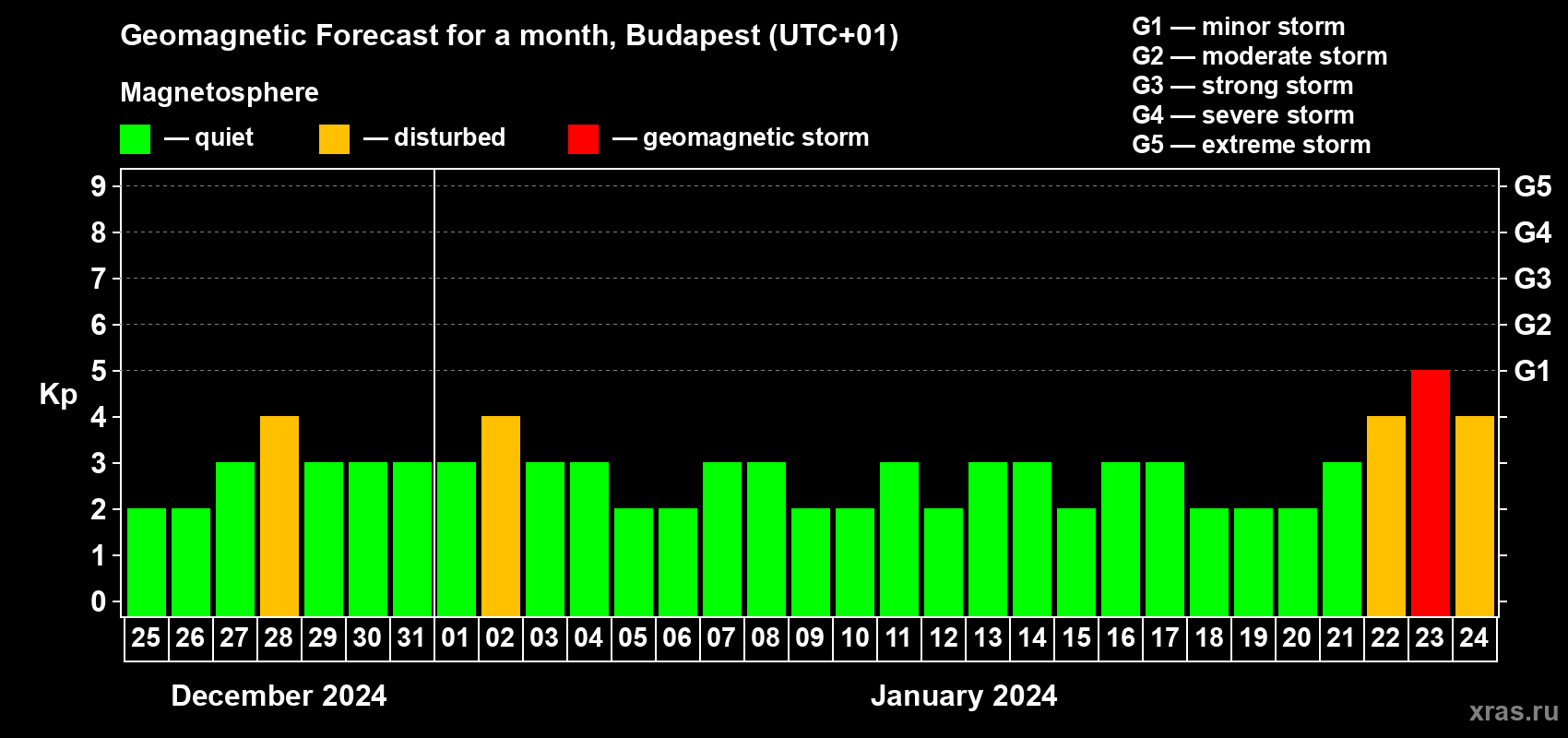 Geomagnetic storm forecast in Budapest for Dec 25, 2023