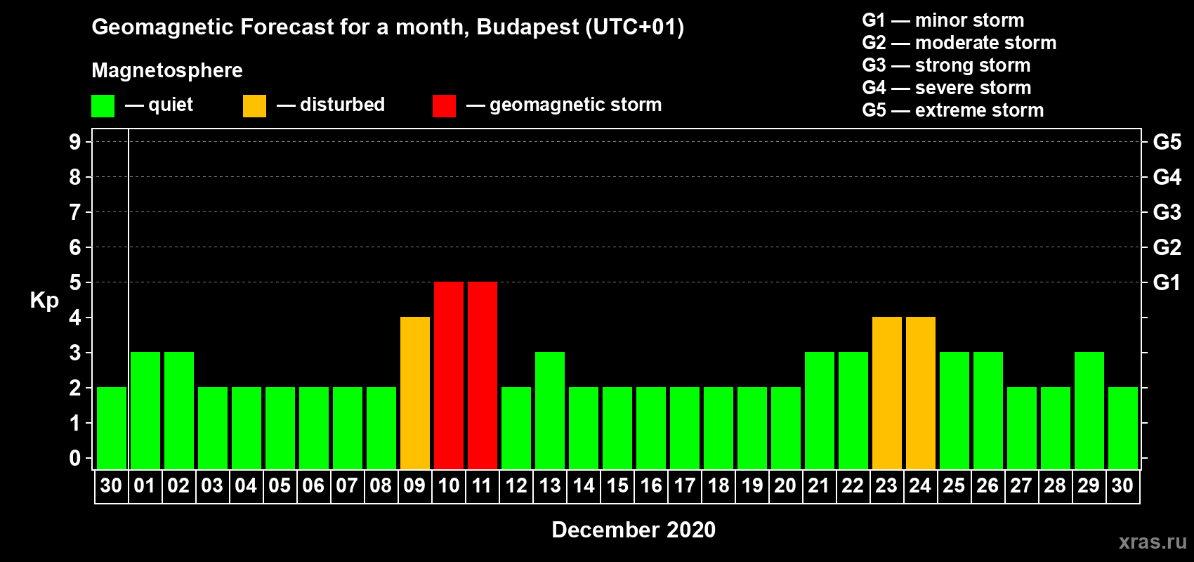 Geomagnetic storm forecast in Budapest for Nov 30, 2020