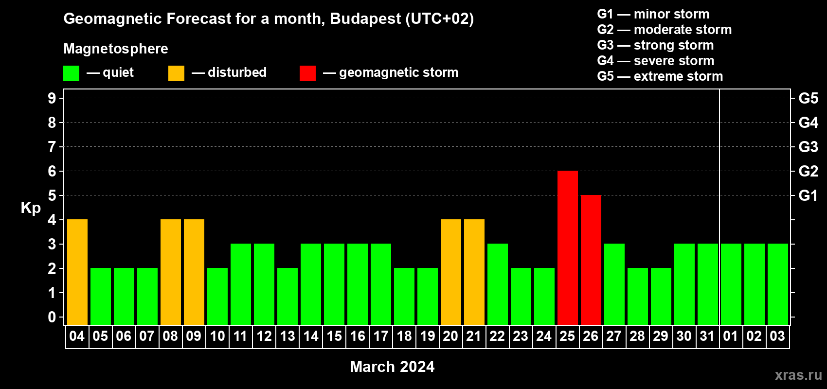 Geomagnetic storm forecast in Budapest for Mar 04, 2024