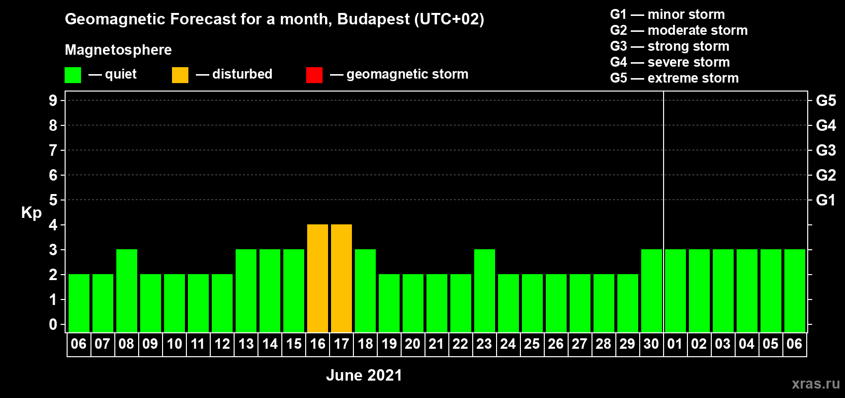 Geomagnetic storm forecast in Budapest for Jun 06, 2021