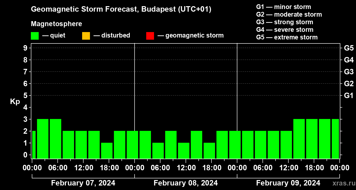 Geomagnetic activity forecast in Budapest — Feb 07, 2024