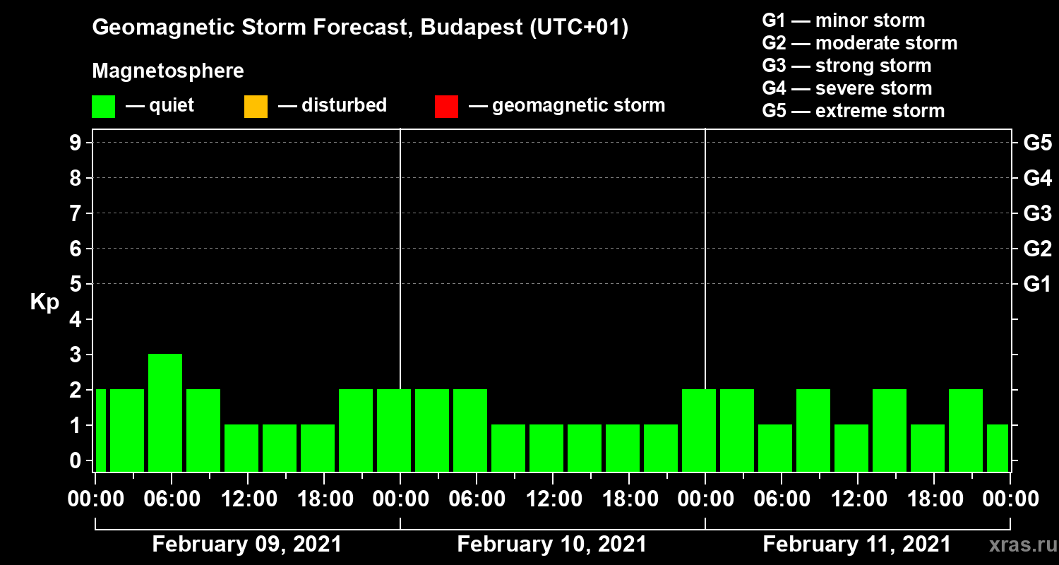 Geomagnetic storm forecast in Budapest for Feb 09, 2021