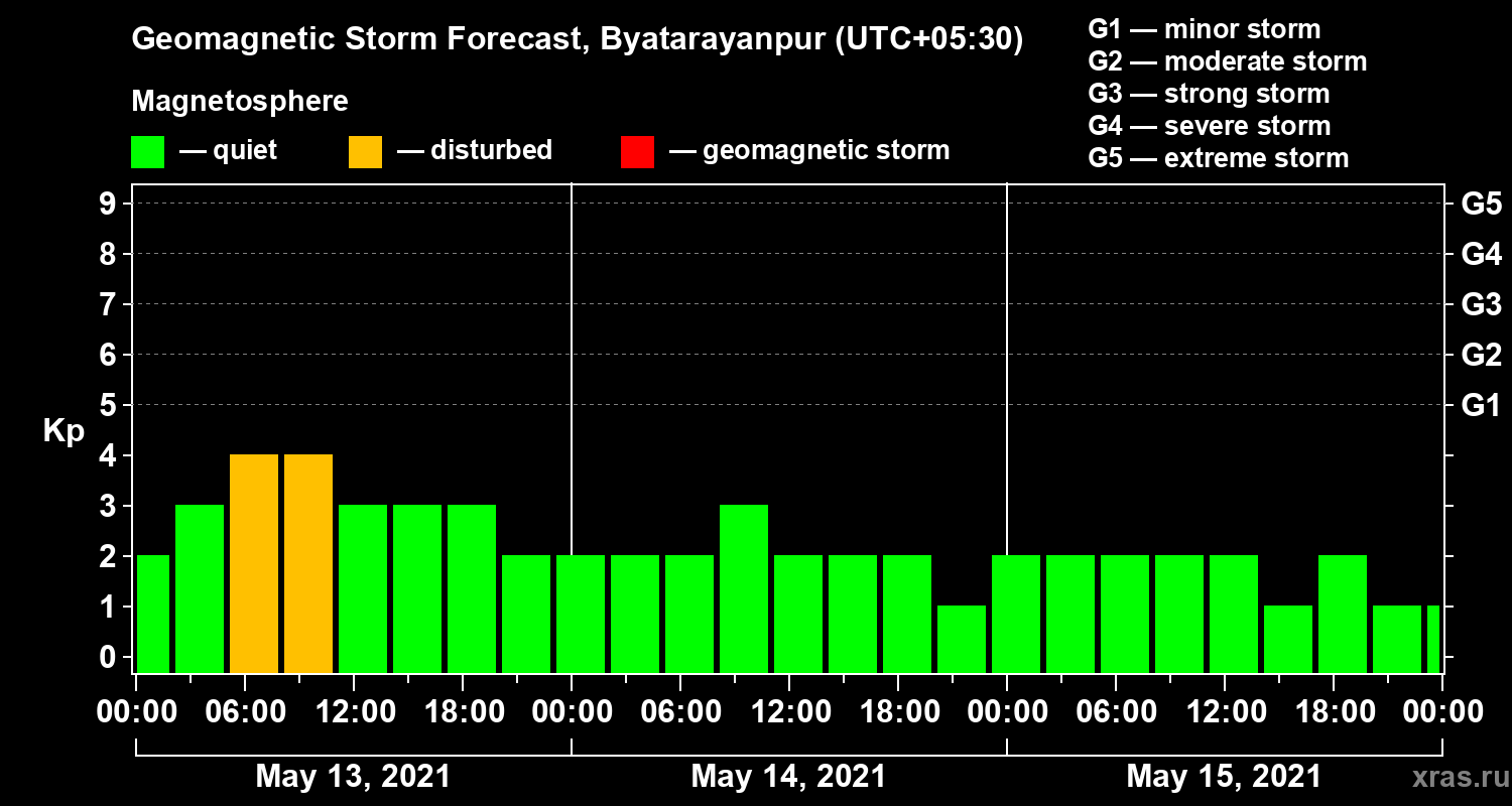 Geomagnetic storm forecast in Byatarayanpur for May 13, 2021