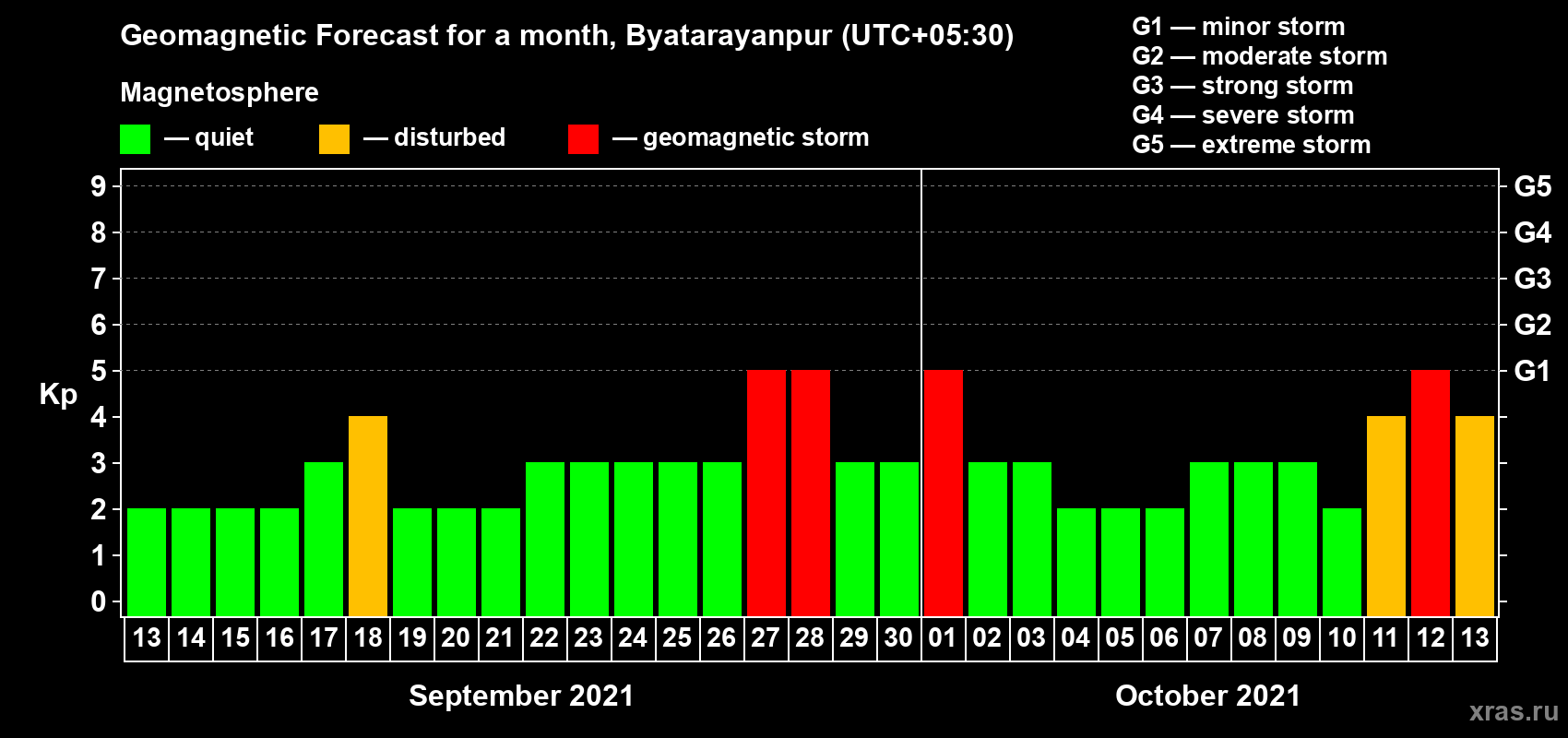 Geomagnetic storm forecast in Byatarayanpur for Sep 13, 2021