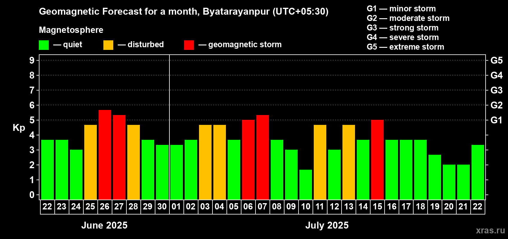 Geomagnetic storm forecast in Byatarayanpur for Jun 22, 2025