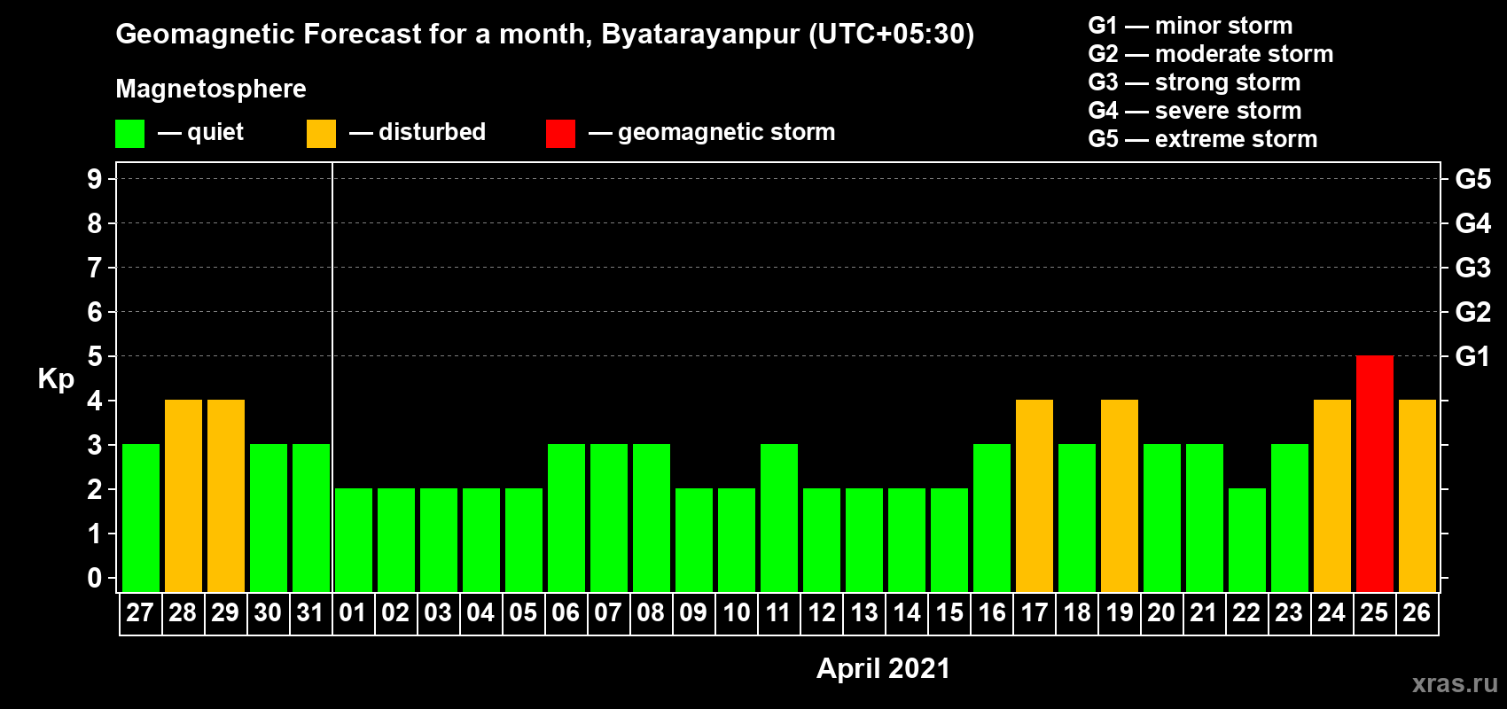 Geomagnetic storm forecast in Byatarayanpur for Mar 27, 2021