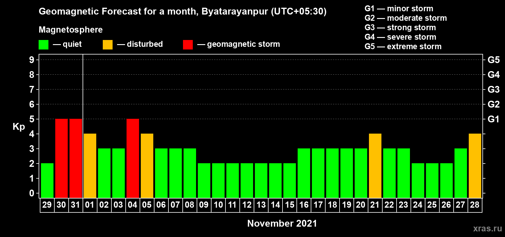 Geomagnetic storm forecast in Byatarayanpur for Oct 29, 2021