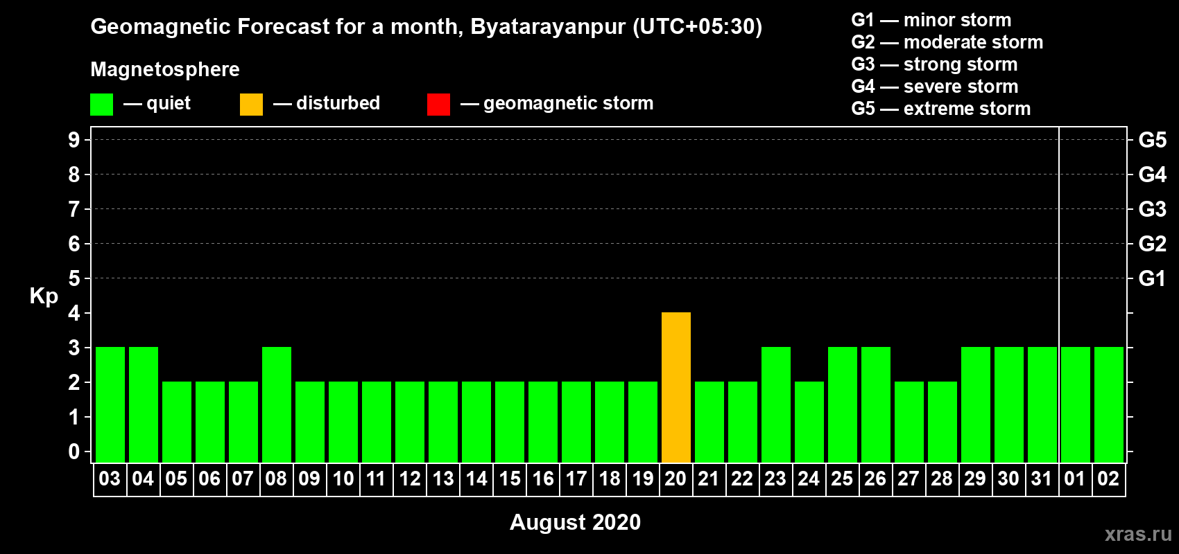 Geomagnetic storm forecast in Byatarayanpur for Aug 03, 2020
