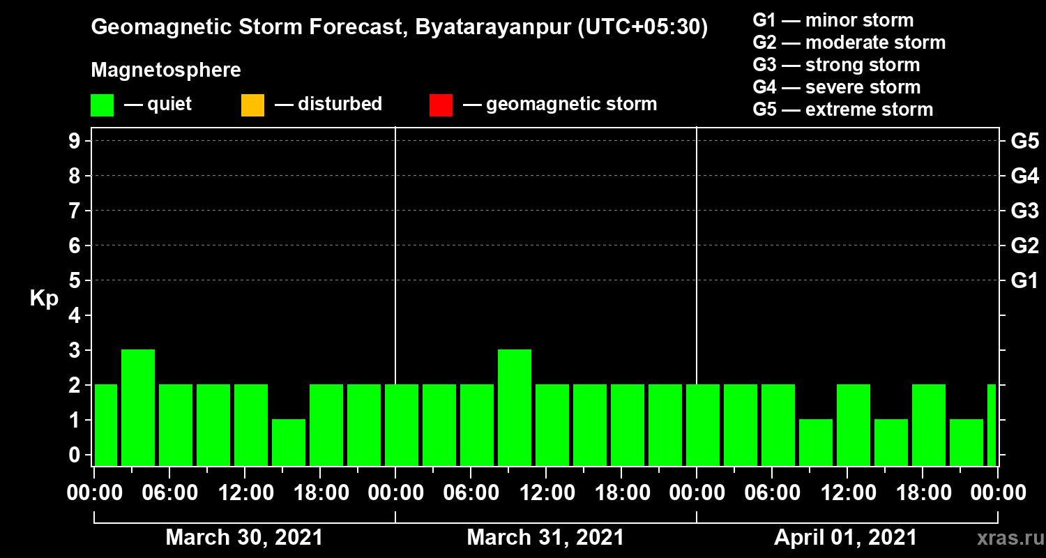 Geomagnetic storm forecast in Byatarayanpur for Mar 30, 2021
