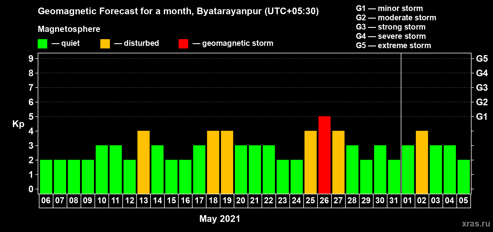 Geomagnetic storm forecast in Byatarayanpur for May 06, 2021