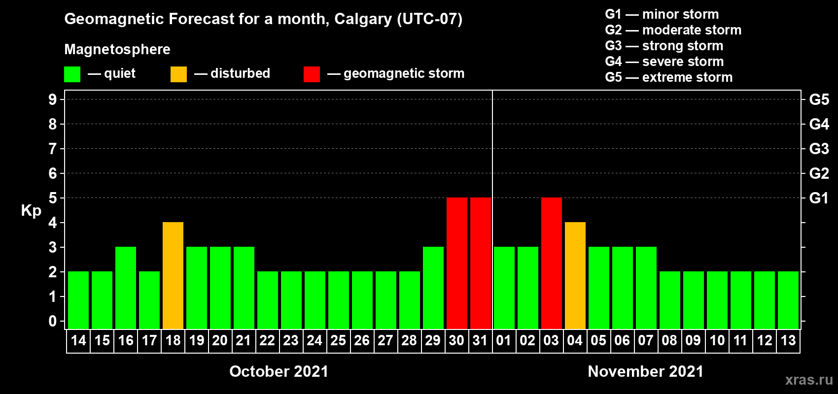Geomagnetic storm forecast in Calgary for Oct 14, 2021