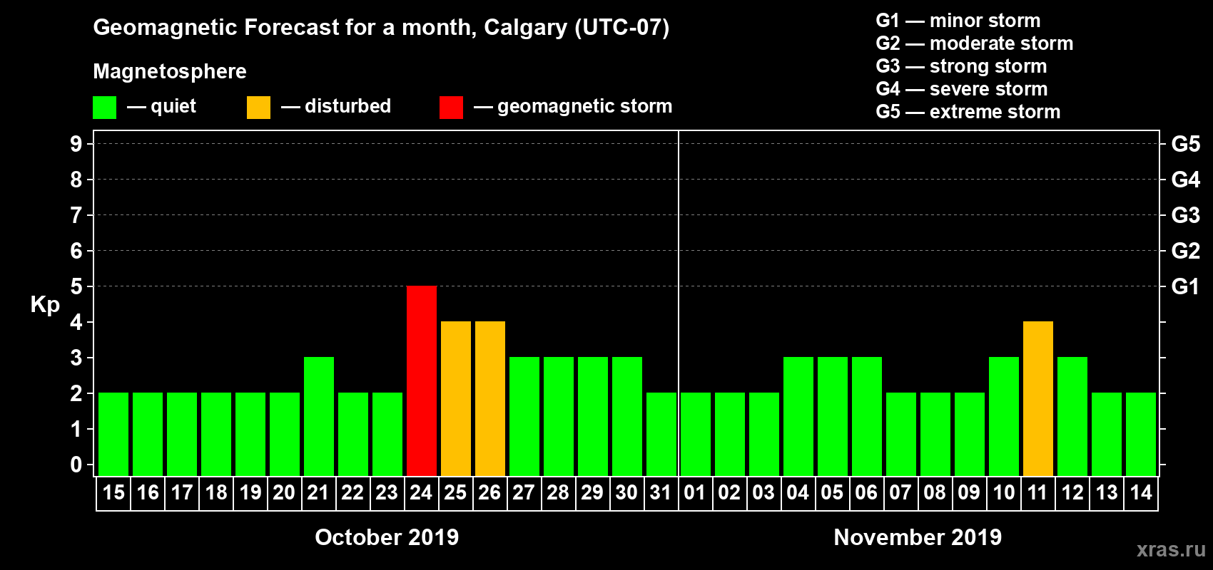 Geomagnetic storm forecast in Calgary for Oct 15, 2019