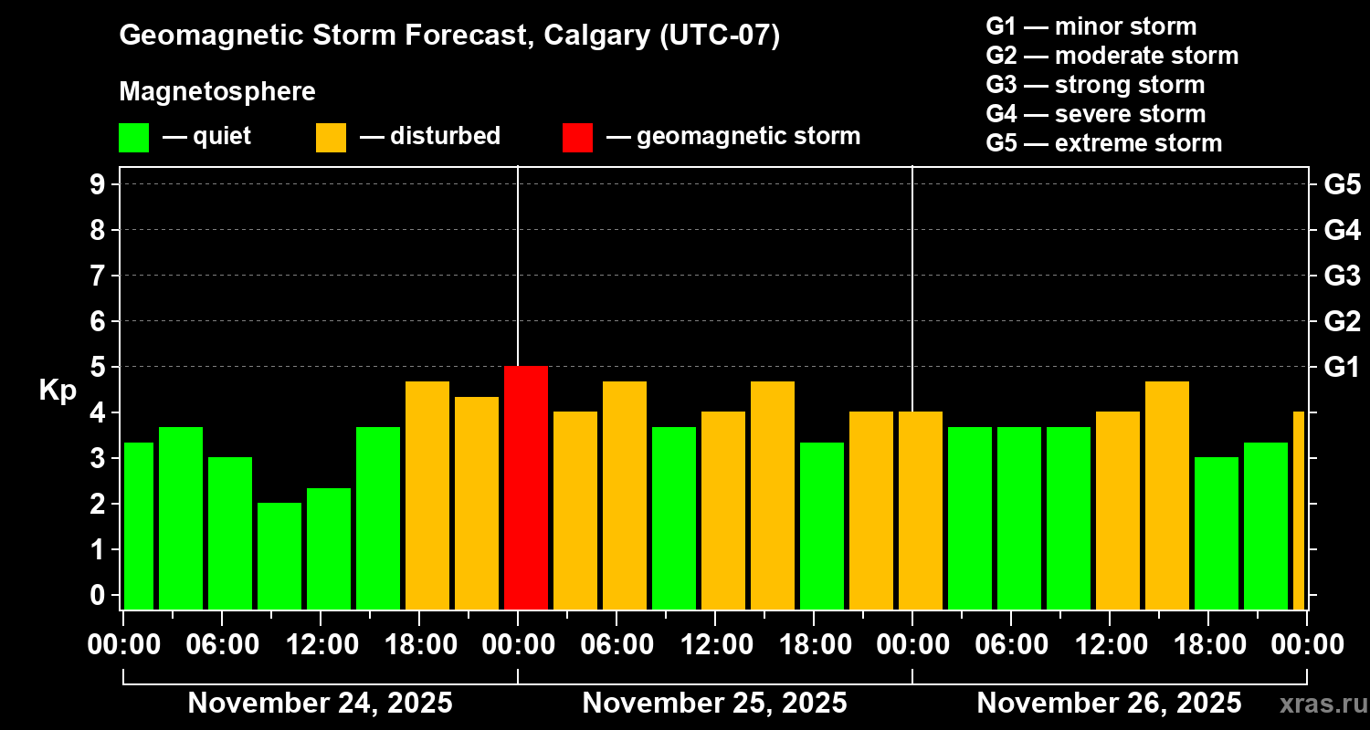 Geomagnetic storm forecast in Calgary for Nov 24, 2025