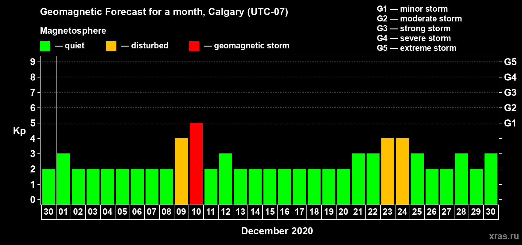 Geomagnetic storm forecast in Calgary for Nov 30, 2020
