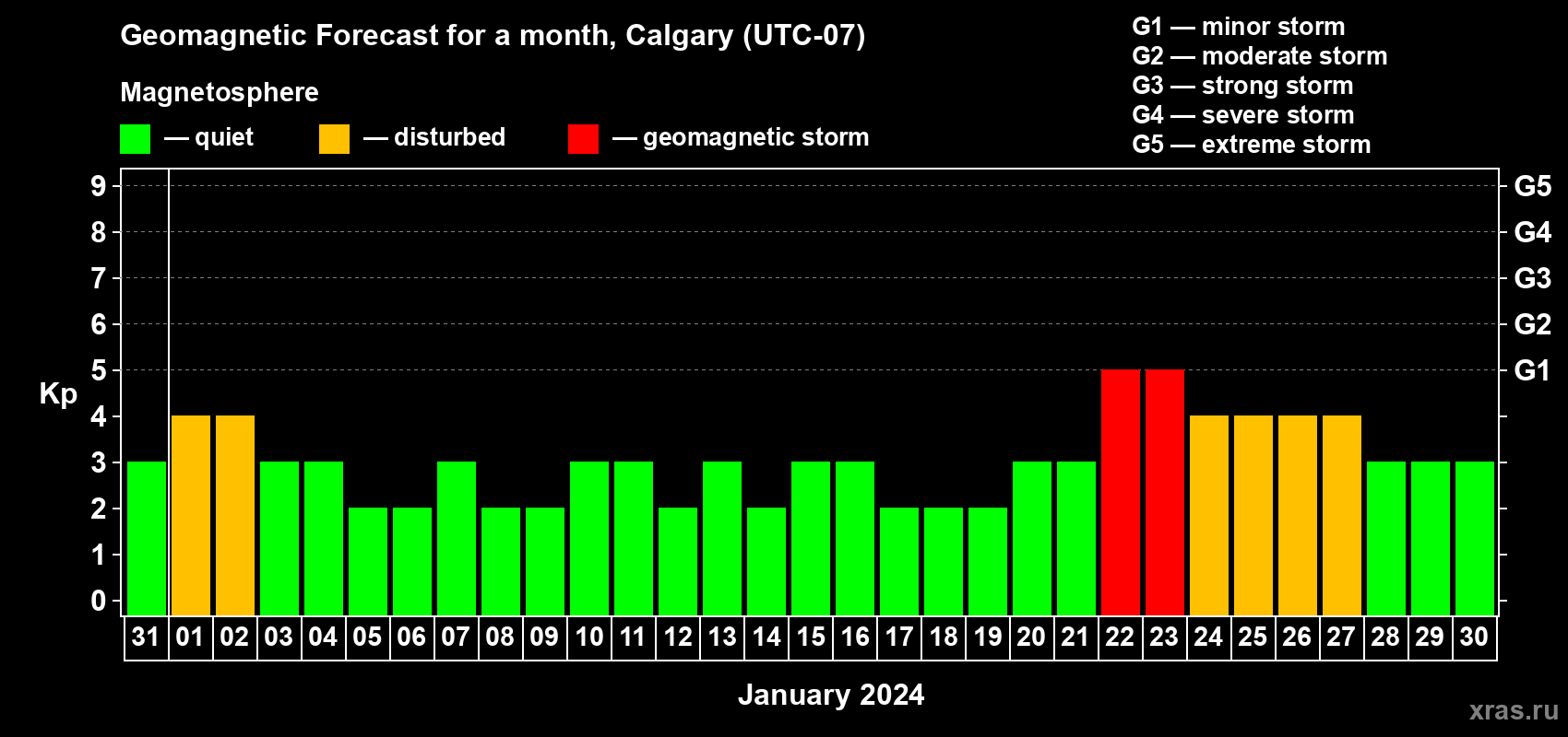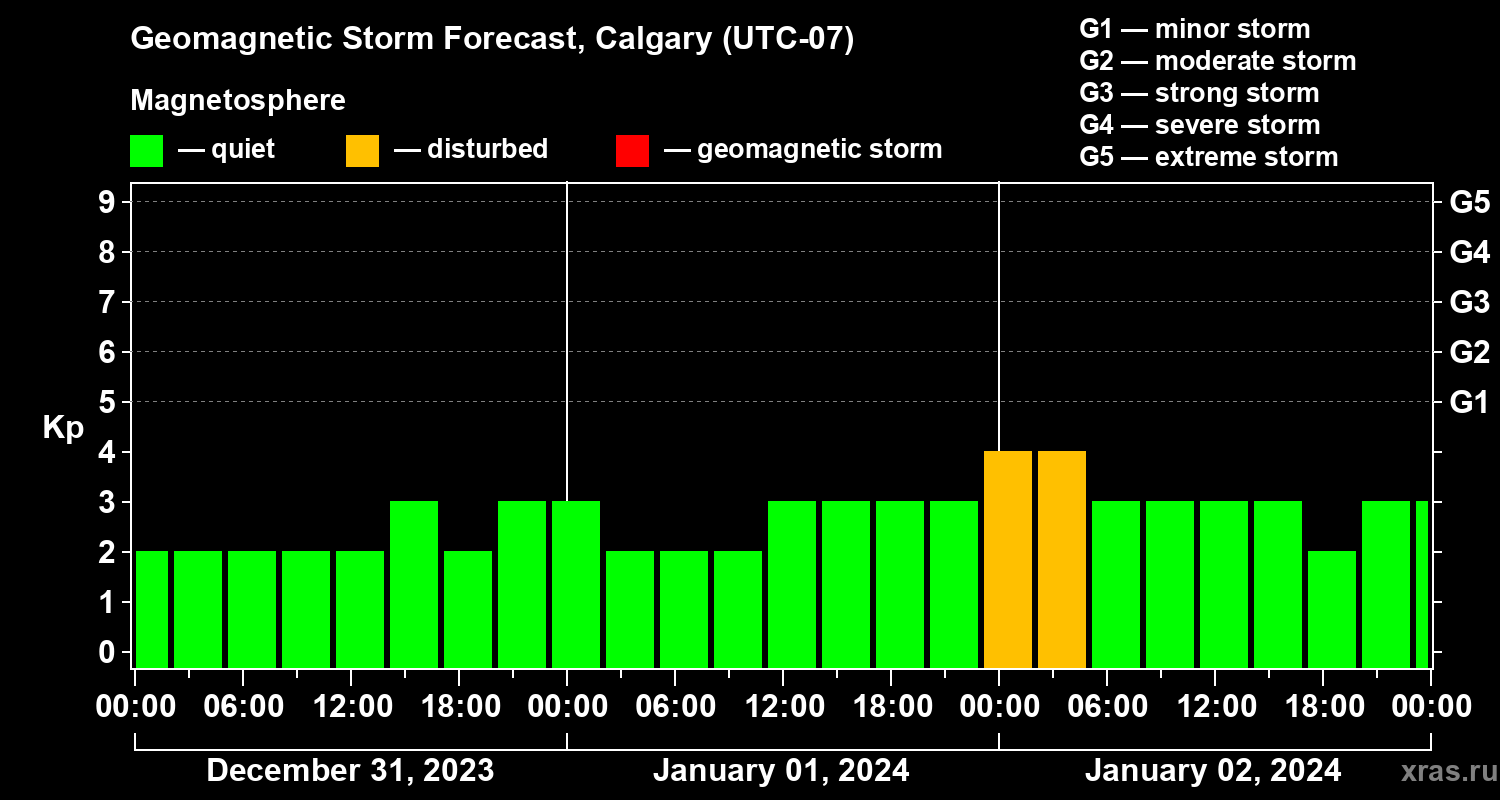 Geomagnetic storm forecast in Calgary for Dec 31, 2023