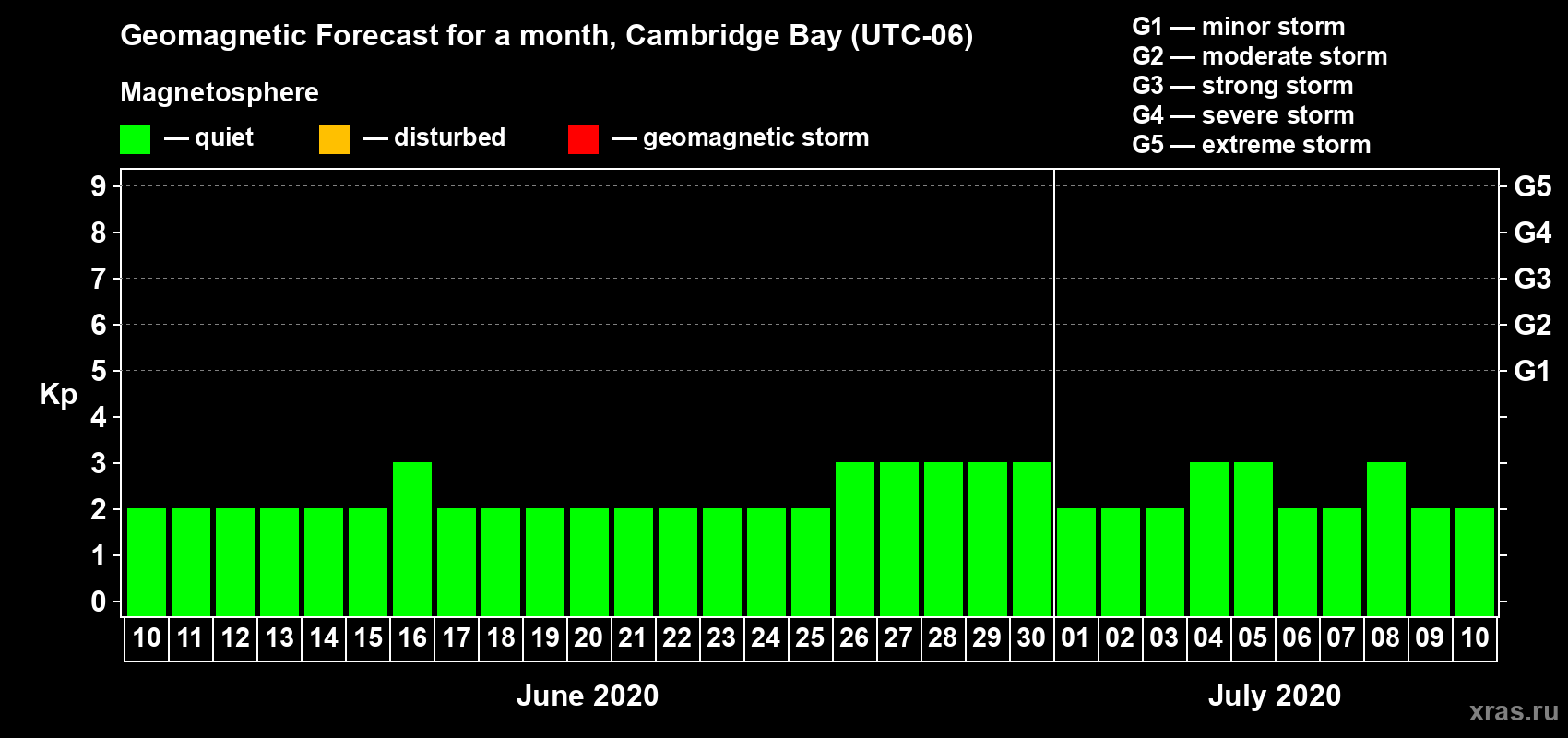 Geomagnetic storm forecast in Cambridge Bay for Jun 10, 2020