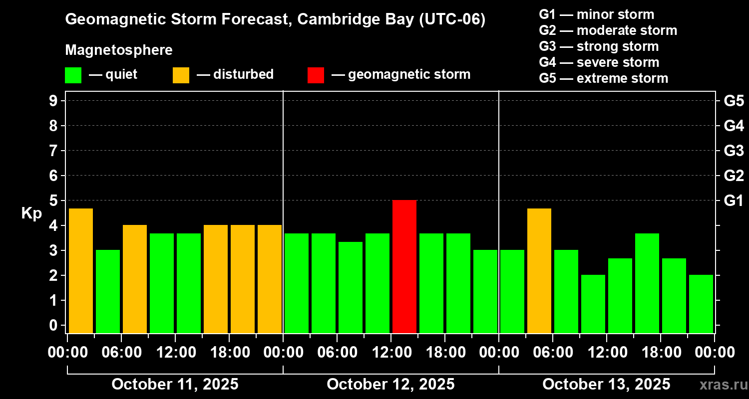 Geomagnetic storm forecast in Cambridge Bay for Oct 11, 2025