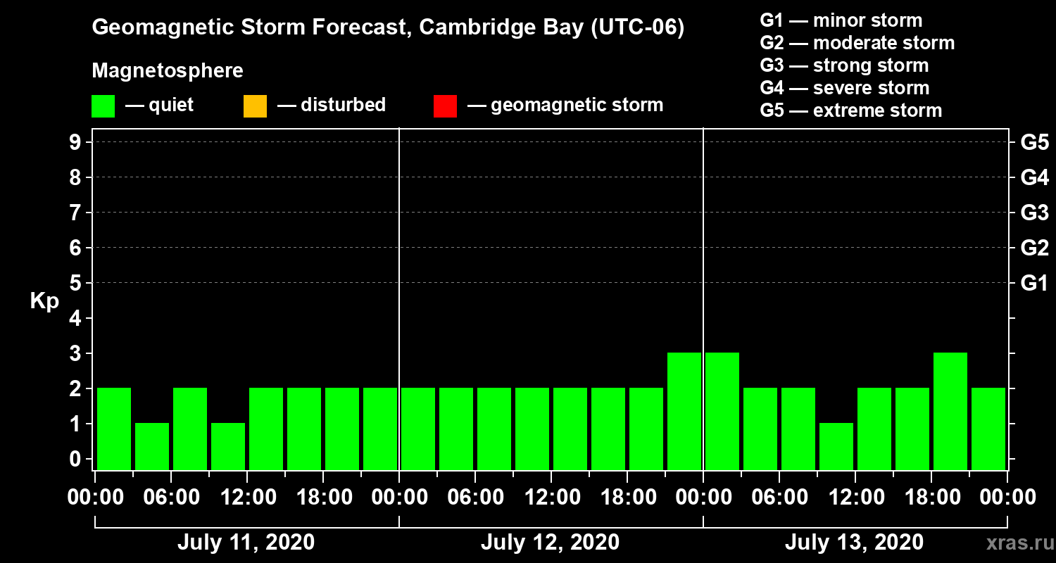 Geomagnetic storm forecast in Cambridge Bay for Jul 11, 2020