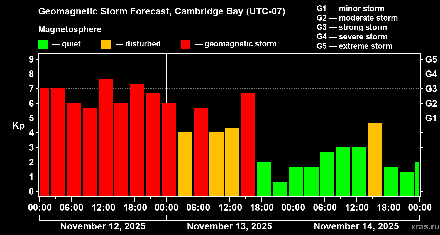 Geomagnetic storm forecast in Cambridge Bay for Nov 12, 2025
