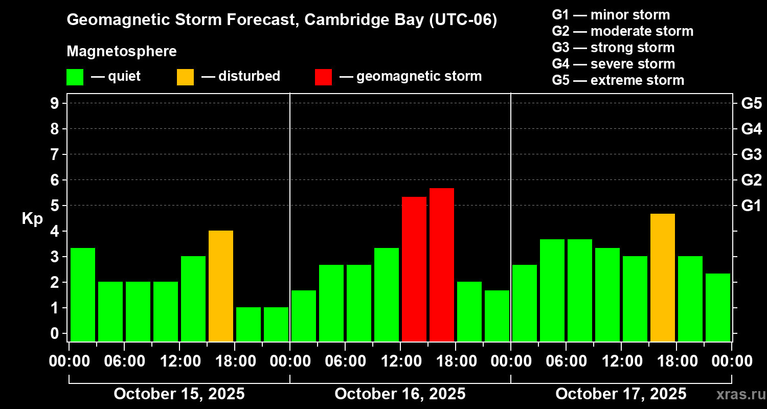 Geomagnetic storm forecast in Cambridge Bay for Oct 15, 2025