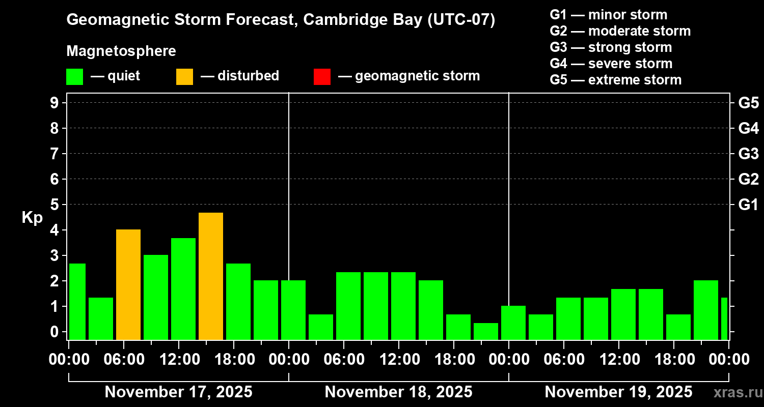 Geomagnetic storm forecast in Cambridge Bay for Nov 17, 2025