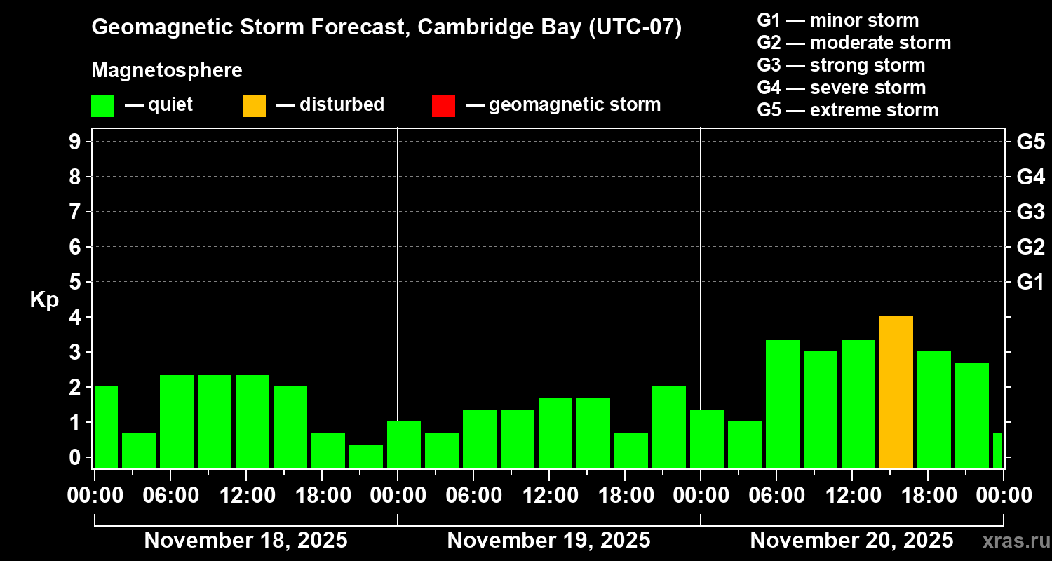 Geomagnetic storm forecast in Cambridge Bay for Nov 18, 2025