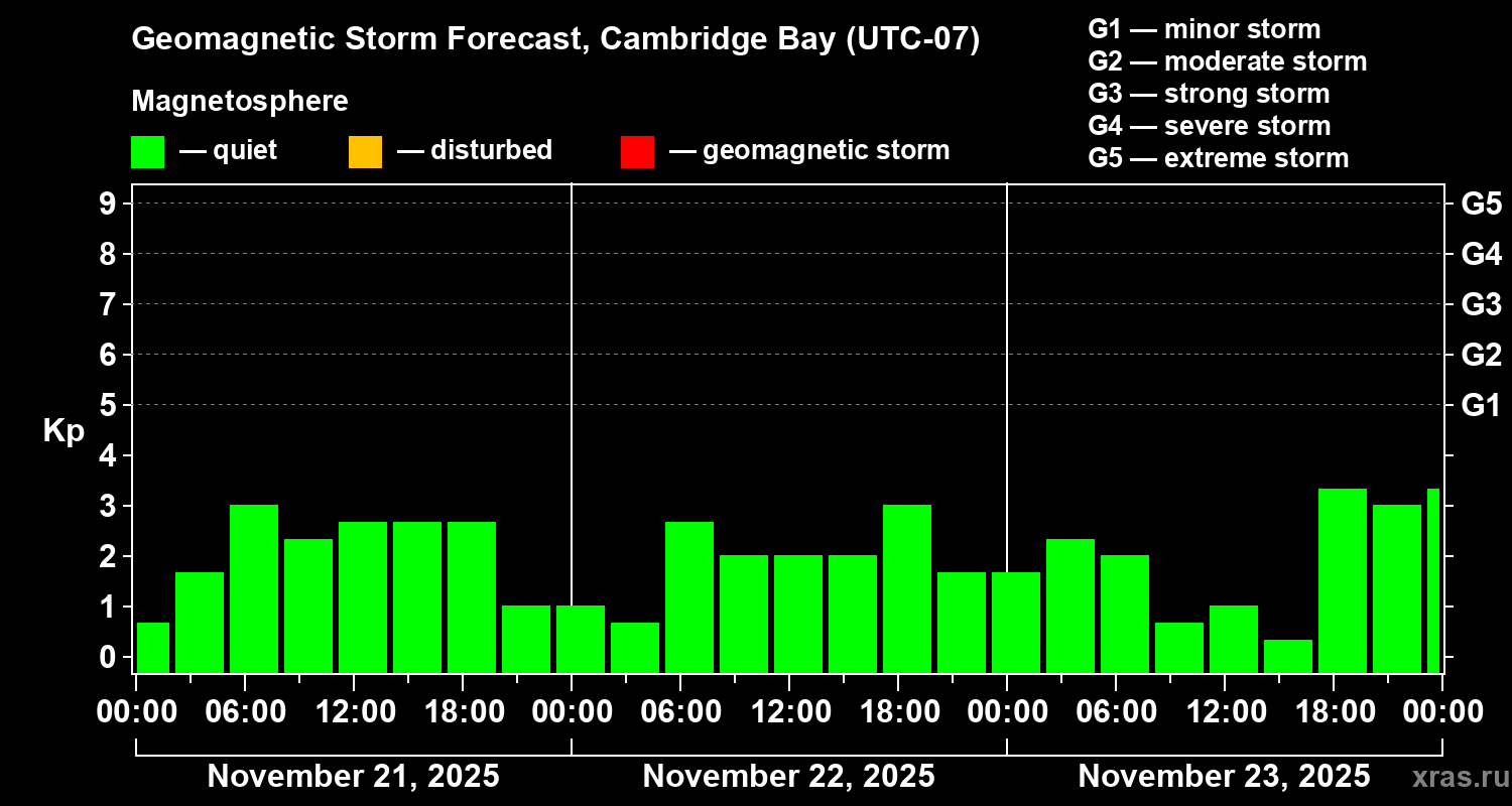 Geomagnetic storm forecast in Cambridge Bay for Nov 21, 2025