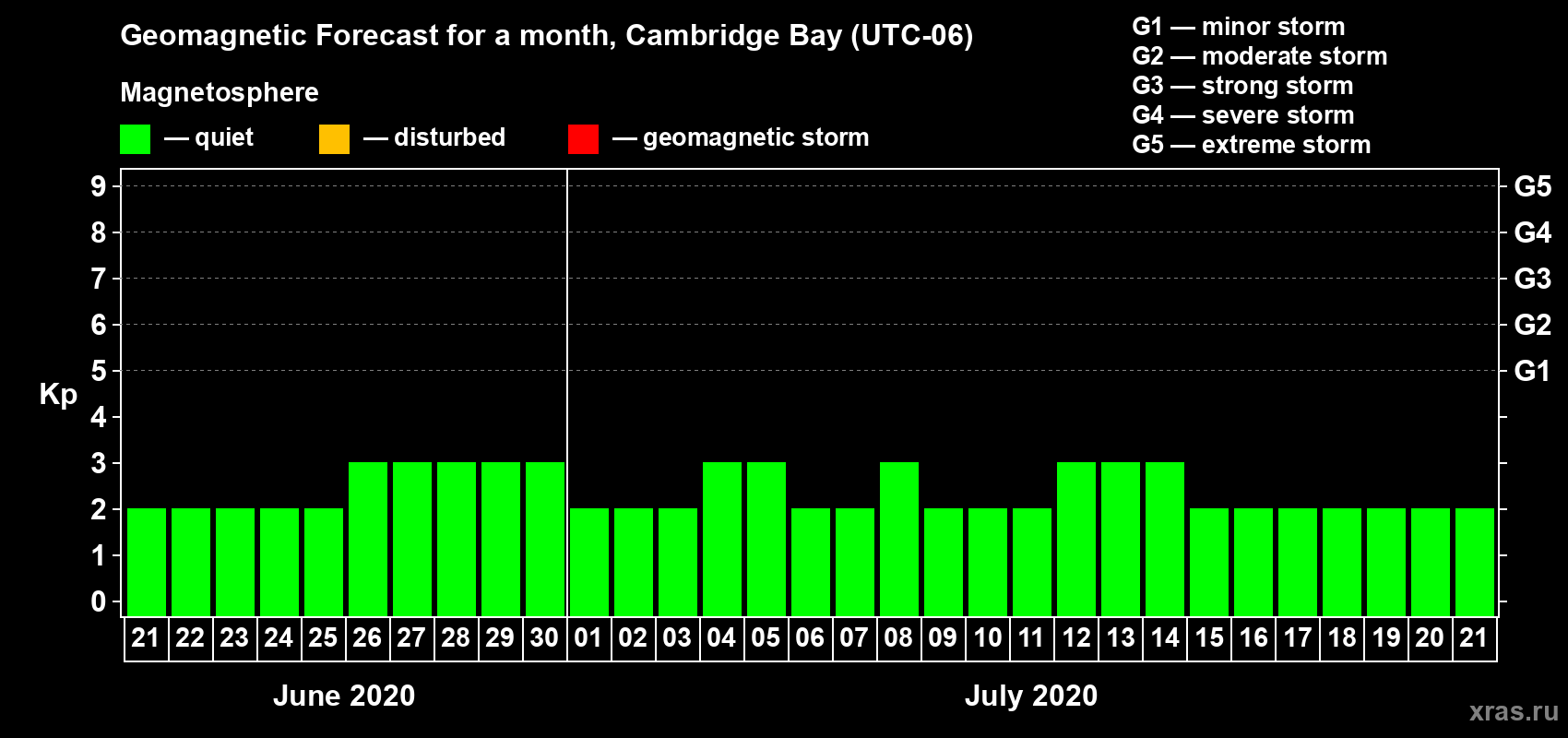 Geomagnetic storm forecast in Cambridge Bay for Jun 21, 2020